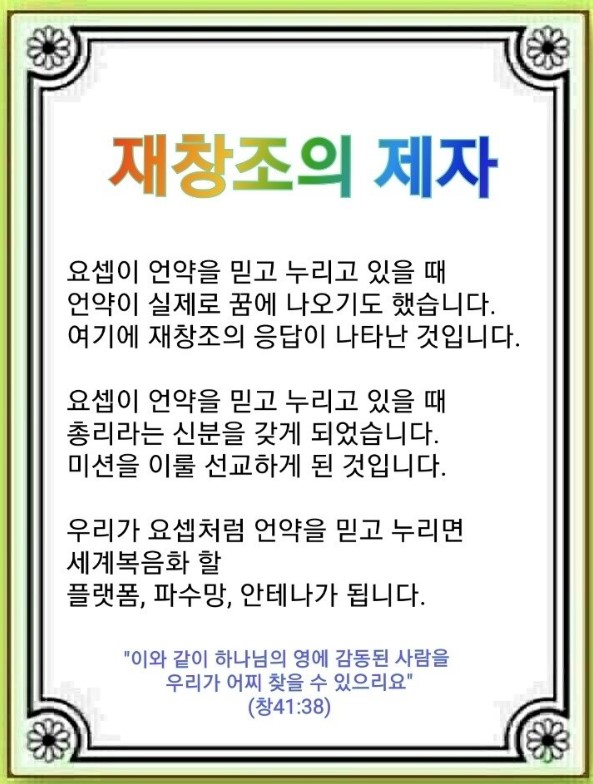 하나님은 언약을 잡고 신분을 누리고 있는 요셉에게 총리라는 신분을 주셨습니다. 이것을 가지고 미션을 이룰 선교를 하게 되었습니다. 올바른 사명이 성취될 실현의 문이 열리게 됩니다. 하나님은 우리에게도 나라와 세계 살릴 권세를 주셨습니다. 세계화를 통한 세계 복음화의 문이 열리게 되었습니다. 이것이 세상을 살리는 안테나의 사명입니다.