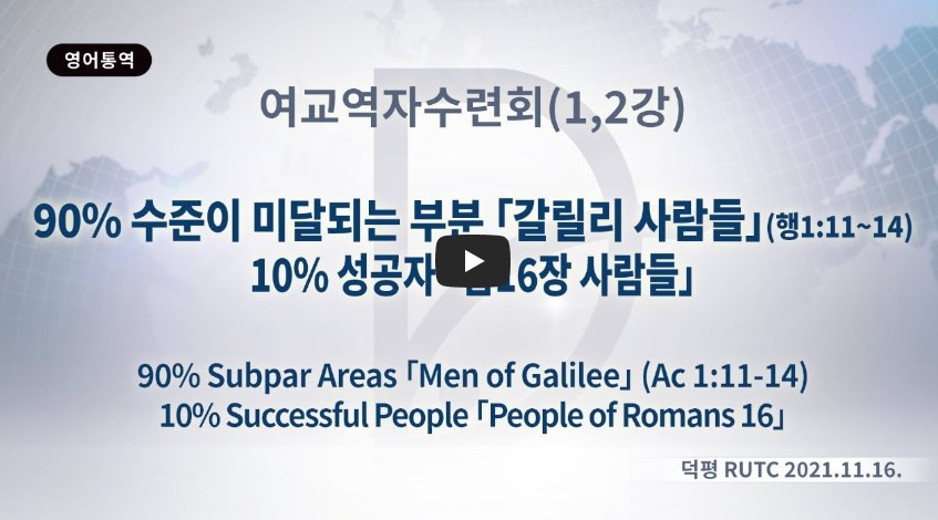 인터넷총국 (홈페이지 http://data.rutc.com) 분류 2021- 제18차 여교역자 수련회 제목 1강: 90%(수준이 미달 되는 부분) → “갈릴리 사람들” 성경 사도행전 1:11-14 일시/장소 2021년 11월 16일, 덕평RUTC 설