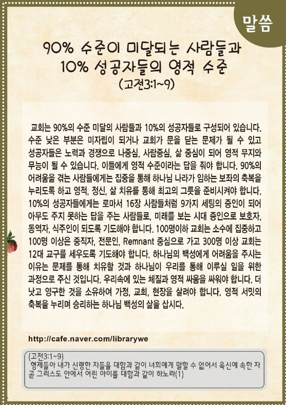 90% 수준이 미달되는 사람들과 10% 성공자들의 영적 수준(고린도전서 3:1~9)