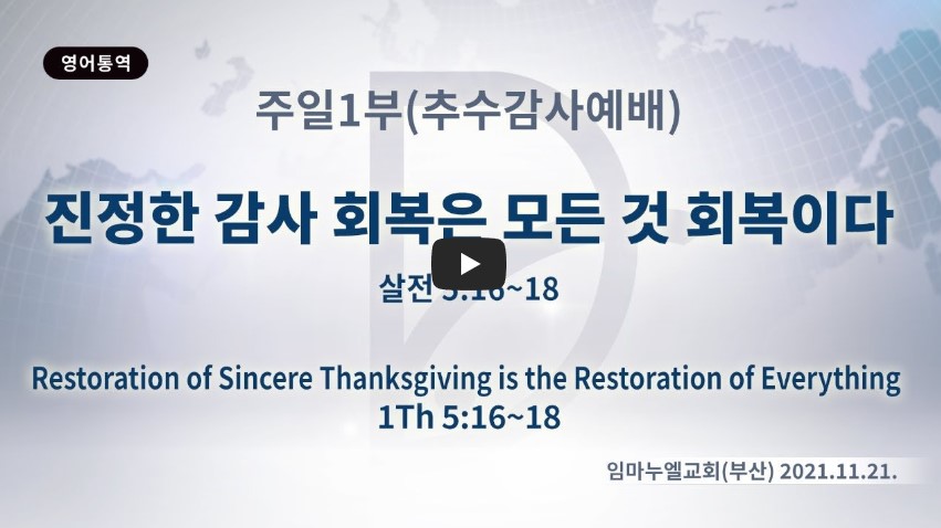 인터넷총국 (홈페이지 http://data.rutc.com) 분류 주일예배 설교- 주일1부 제목 (추수감사절) 진정한 감사 회복은 모든 것 회복이다. 성경 데살로니가전서 5:16-18 일시/장소 2021년 11월 21일, 임마누엘