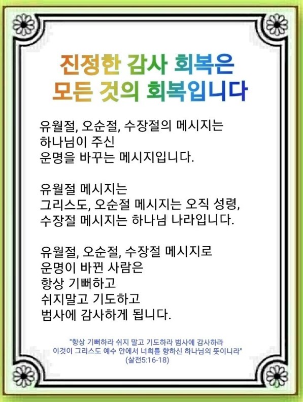 항상 기뻐하라 쉬지 말고 기도하라 범사에 감사하라 이것이 그리스도 예수 안에서 너희를 향하신 하나님의 뜻이니라