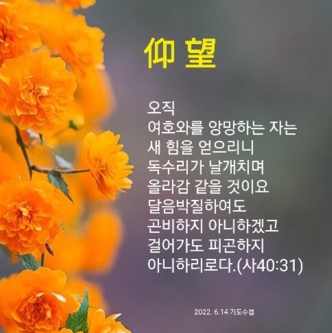오직 여호와를 앙망하는 자는 새 힘을 얻으리니 독수리가 날개치며 올라감 같을 것이요 달음박질하여도 곤비하지 아니하겠고 걸어가도 피곤하지 아니하리로다(31)