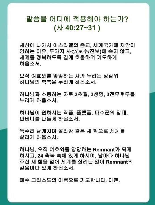 [언약 기도] 하나님, 감사드립니다. 오직 여호와를 앙망하는 Remnant가 되게 하옵소서. 24축복 속에 있게 하옵소서. 날마다 하나님 주신 새 힘을 얻어 세계를 살리는 일이 Remnant의 걸음마다 있게 하옵소서. 예수 그리스도 이름으로 기도합니다. 아멘