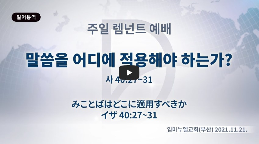 인터넷총국 (홈페이지 http://data.rutc.com) 분류 주일예배 설교- 렘넌트예배 제목 말씀을 어디에 적용해야 하는가? 성경 이사야 40:27-31 일시/장소 2021년 11월 21일, 임마누엘교회 설교 류광수 목사 (