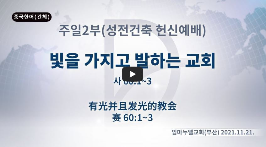 인터넷총국 (홈페이지 http://data.rutc.com) 분류 주일예배 설교- 주일2부 제목 (성전건축헌신) 빛을 가지고 발하는 교회 성경 이사야 60:1-3 일시/장소 2021년 11월 21일, 임마누엘교회 설교 류광수 목사
