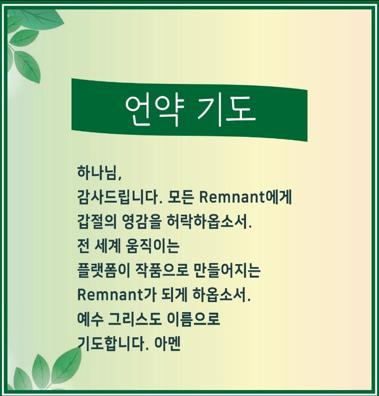 [언약 기도] 하나님, 감사드립니다. 모든 Remnant에게 갑절의 영감을 허락하옵소서. 전 세계 움직이는 플랫폼이 작품으로 만들어지는 Remnant가 되게 하옵소서. 예수 그리스도 이름으로 기도합니다. 아멘