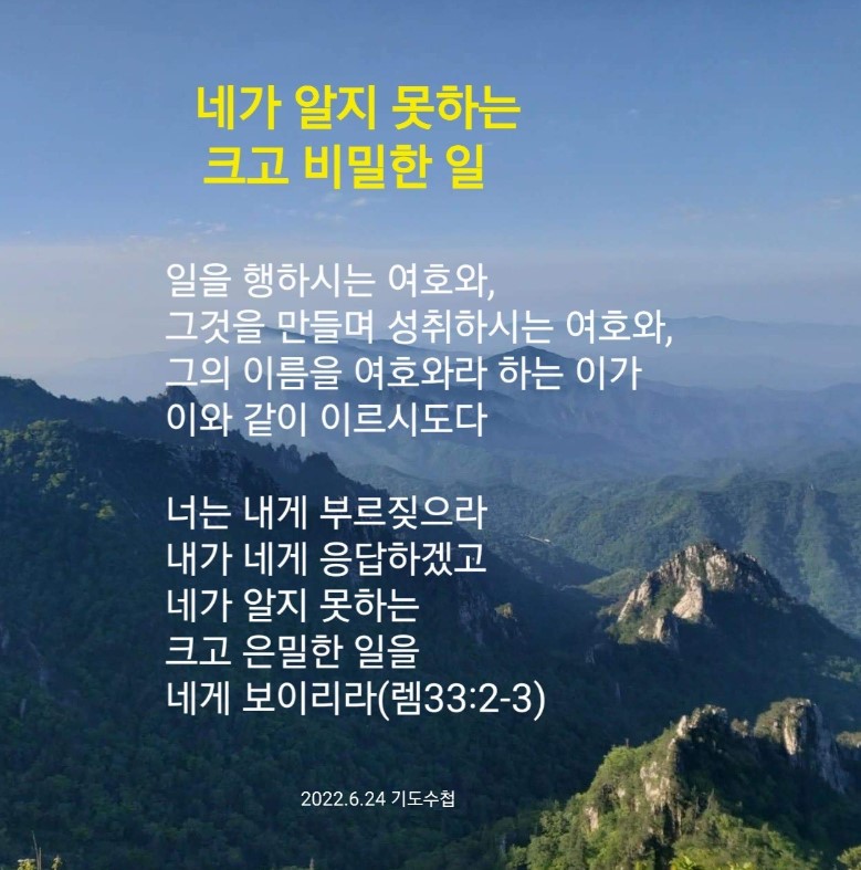 너는 내게 부르짖으라 내가 네게 응답하겠고 네가 알지 못하는 크고 은밀한 일을 네게 보이리라(3)