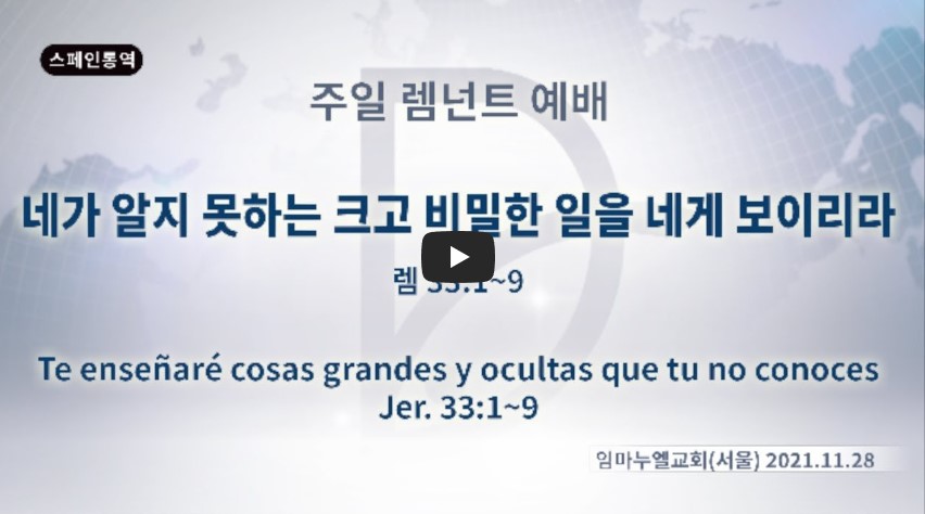 인터넷총국 (홈페이지 http://data.rutc.com) 분류 주일예배 설교- 렘넌트예배 제목 네가 알지 못하는 크고 비밀한 일을 네게 보이리라. 성경 예레미야 33:1-9 일시/장소 2021년 11월 28일, 임마누엘교회(