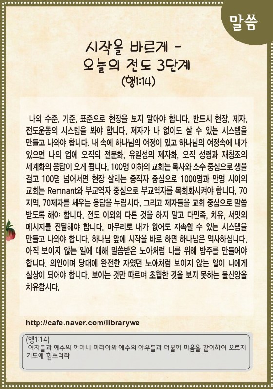 시작을 바르게 - 오늘의 전도 3단계(사도행전 1:14)