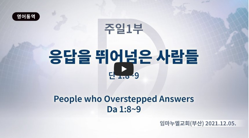 2022년 7월 4일(월) 분류 주일예배 설교- 주일1부 제목 응답을 뛰어 넘은 사람들 성경 다니엘 1:8-9 일시/장소 2021년 12월 5일, 임마누엘교회(부산) 설교 류광수 목사 (녹취정리: 차동호 목사) 출처 (