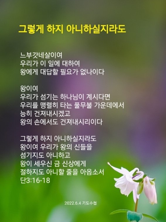 ‘그리 아니하실지라도’ 이것은 항상 가지고 있어야 되는 Remnant의 신앙고백입니다. 응답은 ‘즉시 오는 응답’과 시간이 지나서 오는 ‘이후의 응답’, 하나님이 보시기에 필요 없으니 안 주시는 ‘무응답’이 그것입니다. 기도가 시작되기를 바랍니다.