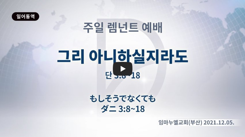 2022년 7월 5일(화) 분류 주일예배 설교- 렘넌트예배 제목 그리 아니하실지라도 성경 다니엘 3:8-18 일시/장소 2021년 12월 5일, 임마누엘교회(부산) 설교 류광수 목사 (녹취정리: 차동호 목사) 출처 (