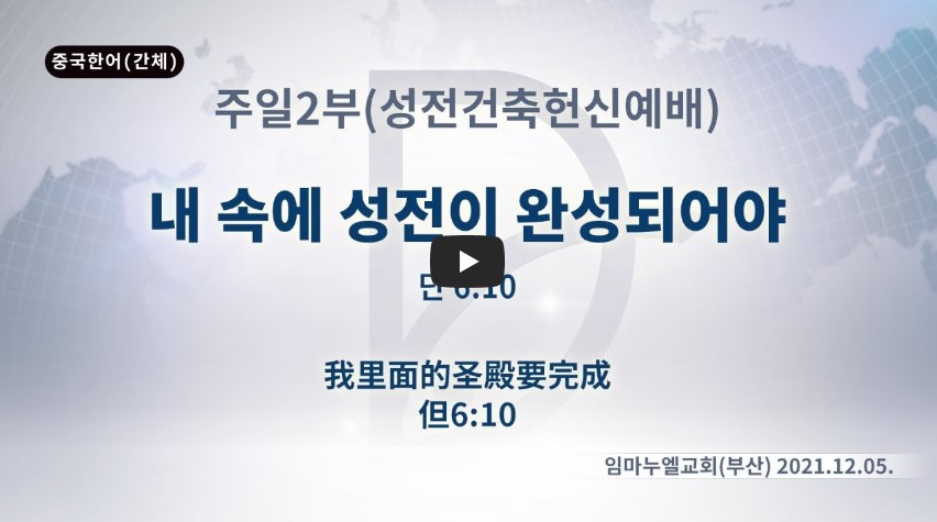 2022년 7월 6일(수) 분류 주일예배 설교- 주일2부 제목 (성전건축헌신) 내 속에 성전이 완성되어야 성경 다니엘 6:10 일시/장소 2021년 12월 5일, 임마누엘교회(부산) 설교 류광수 목사 (녹취정리: 차