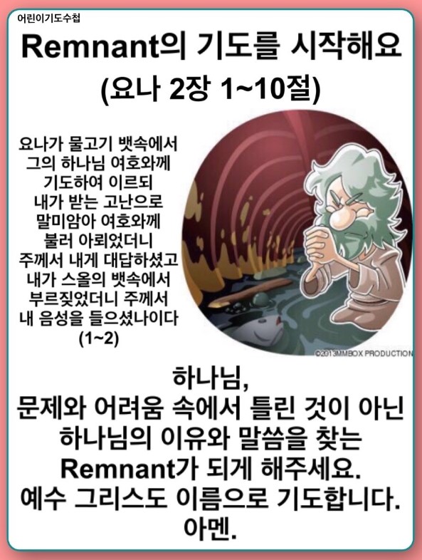 요나가 물고기 뱃속에 들어가는 큰 위기를 만났습니다. Remnant들은 어려움과 상관없이 세 가지를 알아야 합니다. 어른들은 틀린 것 잡고 틀린 생각을 해서 착각에 빠져 있습니다. 하나님은 새로운 시작을 하도록 고난 가운데 몰아가시기도 합니다. 이것을 Remnant가 깨달으면 응답받습니다. 여러분은 하나님 자녀이기 때문에 세 가지를 가지고 시작해야 합니다. 성삼위 하나님과 5력이 내게 임하고 전달하는 것이 기도입니다. 이때 보좌의 축복 9가지가 세팅됩니다. 그리고 3시대를 교회에서 이루게 되고 진짜 달란트가 나옵니다. 여러분에게 하나님 은혜로 기도할 자격이 있습니다. 여러분의 고통은 도전이 됩니다. 하나님은 기도에 응답하십니다.