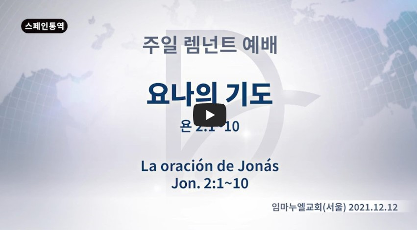 2022년 7월 11일 (월) 분류 주일예배 설교- 렘넌트예배 제목 요나의 기도 성경 요나 2:1-10 일시/장소 2021년 12월 12,일, 임마누엘교회(서울) 설교 류광수 목사 (녹취정리: 차동호 목사) 출처 (사) 세계