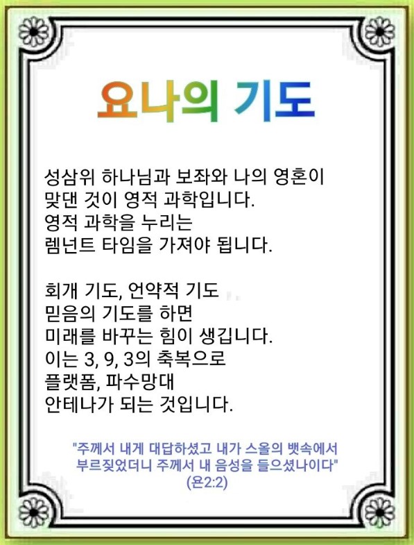 기도를 알면 3•9•3 축복이 여러분에게 플랫폼이 되고, 전 세계를 살리는 파수 망대가 되며, 전 세계와 하나님과 통하는 영적 안테나가 됩니다. Remnant 때 중요한 작품을 만들어야 합니다. 기도 수첩에 메모하는 것이 최고 작품입니다.