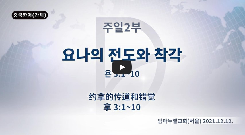 2022년 7월 12일 (화) 분류 주일예배 설교- 주일2부 제목 요나의 전도와 착각 성경 요나 3:1-10 일시/장소 2021년 12월 12일, 임마누엘교회(서울) 설교 류광수 목사 (녹취정리: 차동호 목사) 출처 (사) 세