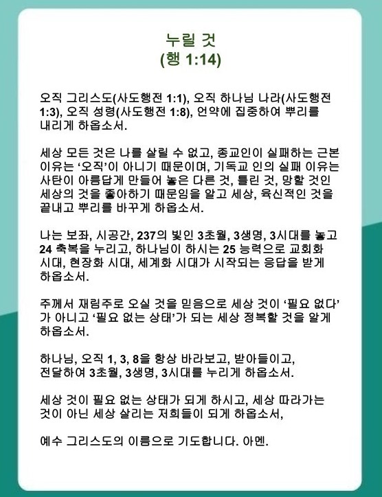 [언약 기도] 하나님 감사드립니다. 오직 1, 3, 8을 항상 바라보고, 받아들이고, 전달하여 3초월, 3생명, 3시대를 누리게 하옵소서. 세상 것이 필요 없는 상태가 되게 하옵소서, 세상 따라가는 것이 아닌 세상 살리는 저희들이 되게 하옵소서, 예수 그리스도 이름으로 기도합니다. 아멘