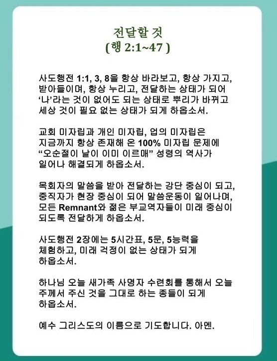 우리는 사도행전 1:1, 3, 8을 항상 바라보고, 항상 받아들이고, 항상 누려야겠습니다. 이제 이것을 우리가 가지고 전달해야겠습니다. 이때 우리의 상태가 ‘나’라는 것이 없어도 되는 상태로 바뀝니다. 우리의 뿌리가 바뀌고 세상 것이 필요 없는 상태가 됩니다.