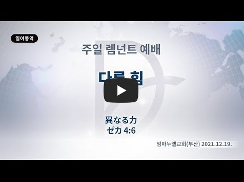 2022년 7월 20일(수) 분류 주일예배 설교- 렘넌트예배 제목 다른 힘 성경 스가랴 4:6 일시/장소 2021년 12월 19일, 임마누엘교회 (부산-온라인) 설교 류광수 목사 (녹취정리: 차동호 목사) 출처 (사) 세