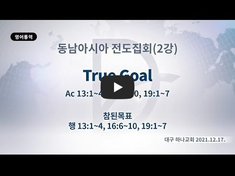 2022년 7월 23일(토) 분류 2021- 동남아 전도집회 제목 2강: True Goal 성경 사도행전 13:1-4, 16:6-10, 19:1-7 일시/장소 2021년 12월 20일-21일, 대구 하나교회(온라인) 설교 류광수 목사 (녹취정리: 차동호 목사)