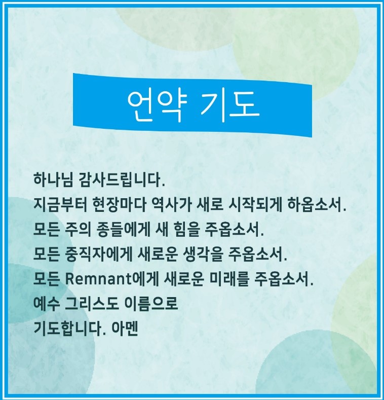 [언약 기도] 하나님 감사드립니다. 말씀에 있는 것을 찾아 누리게 하옵소서. 그리스도께서 직접 주신 말씀을 찾아 누리게 해 주옵소서. 유일하게 세계를 정복한 초대교회 언약을 붙잡게 하옵소서. 예수 그리스도 이름으로 기도합니다. 아멘