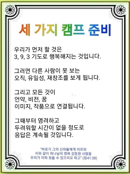 이때부터 요셉이 3캠프를 본 것입니다. 다른 사람이 못 본 것을 요셉만 보았습니다. 이것이 ‘오직’이며 미래 캠프입니다. 다른 사람은 절대 못 받는데 요셉만 응답받았습니다. 이것이 ‘유일성’이며 기도 캠프입니다. 전 세계가 죽는데 요셉만이 살릴 수 있습니다. 재창조입니다. 이것이 달란트 캠프입니다. 이것은 이(3•9•3) 기도를 한 만큼 보이게 됩니다.