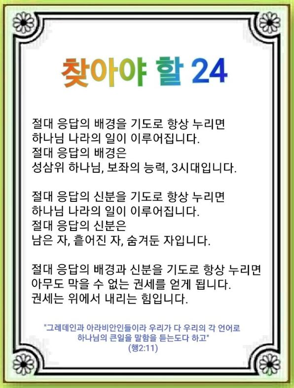 우리가 찾아야 할 24는 복음을 가지고 누리는 영적 서밋입니다. 복음 영적 서밋의 파수꾼으로 설 때, 파수꾼의 24입니다. 복음을 영적으로 제대로 누리는 서밋이 탑(Top)이 되고 고수가 되면 이때 절대 응답이 따라옵니다. 이 절대 응답의 배경과 신분을 누릴 때 권세가 따라옵니다. 이 언약을 잡은 사람들이 마가 다락방의 흩어진 사람들(사도행전 2:9~11)이었습니다.