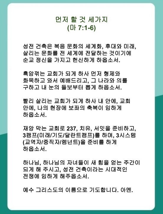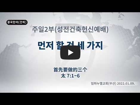 2022년 8월 16일 (화) 분류 주일예배 설교- 주일2부 제목 (성전건축헌신예배) 먼저 할 것 세가지 성경 마태복음 7:1-6 일시/장소 2022년 1월 9일, 임마누엘교회(부산) 설교 류광수 목사 (녹취정리: 차동