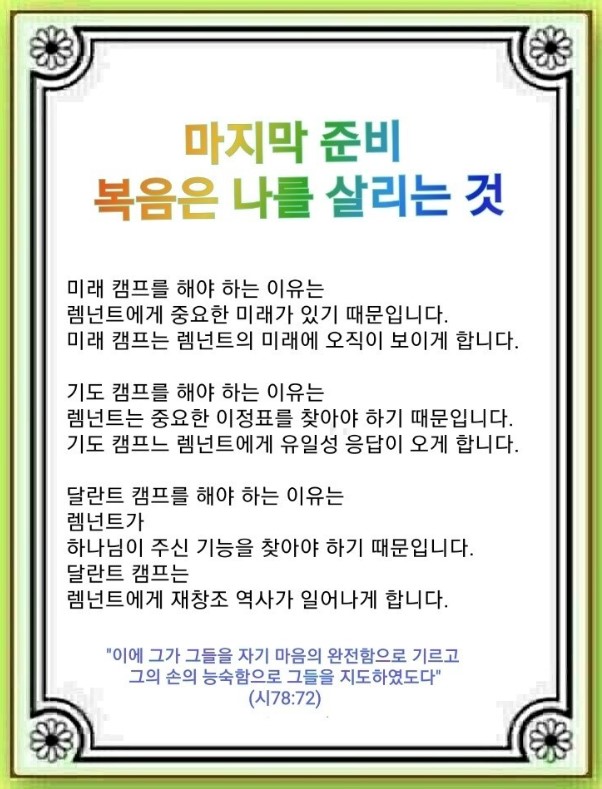 중요한 마지막 준비를 해야 하는데 5분만 복음으로 나를 살리면 됩니다. 이것이 발전되어 9가지 여정이 됩니다. 5분만 묵상해도 내 영이 살아나는데, 이때 창조의 빛(창세기 1:3)과 하나님의 형상(창세기 1:27)과 하나님의 생기(창세기 2:7)가 들어옵니다. 특히 기도하면서 깊은 호흡을 하면 뇌를 살립니다. 이때 내 몸도 살아나는데 중요한 것은 리듬을 살려내는 것입니다. 순간순간 운동도 하고 좋은 음식도 먹으면 평생 건강해집니다. 이러면 영적 상태가 달라집니다. 문제, 갈등, 위기가 오면 평생을 놓고 오늘을 보면서 이것이 내게 필요한 것이라는 답이 나오고 내가 새롭게 되는 기회가 됩니다. 그래서 평안과 감사, 능력이 생깁니다. 이때 영적 서밋이 됩니다. 이제 먼저 세 가지 여정(3 캠프)을 찾고 그릇 준비해야 합니다.