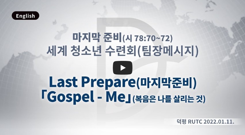 2022년 8월 17일 (수) 분류 2022- 세계청소년수련회- 팀장수련회 제목 “Gospel- Me” 성경 일시/장소 2022년 1월 12일, 덕평RUTC(온라인) 설교 류광수 목사 (녹취정리: 차동호 목사) 출처 (사) 세계복음화