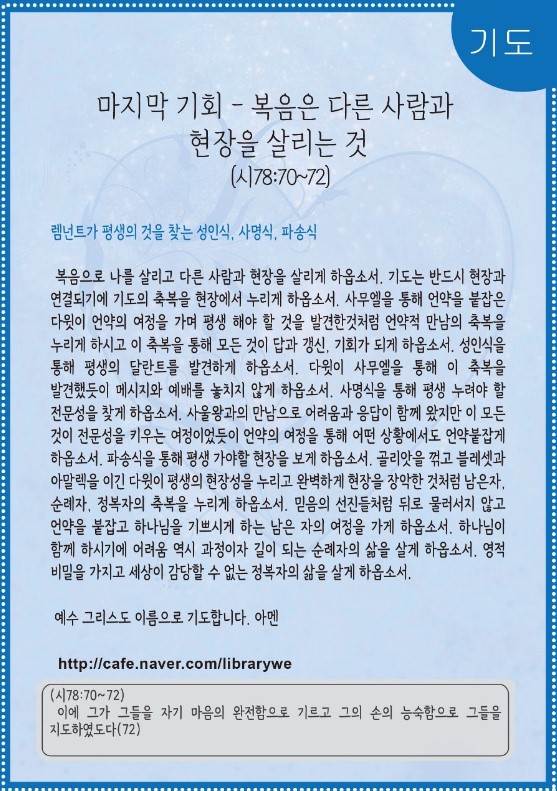 마지막 기회 – 복음은 다른 사람과 현장을 살리는 것(시편 78:70~72)