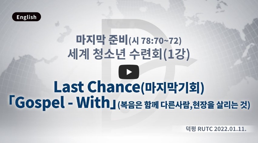 2022년 8월 18일 (목) 분류 2022- 세계청소년수련회 제목 1강: Last chance: “Gospel- WITH” 성경 일시/장소 2022년 1월 12일, 덕평RUTC교회(온라인) 설교 류광수 목사 (녹취정리: 차동호 목사) 출처 (사) 세계