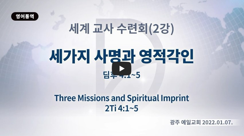 2022년 8월 27일 (토) 분류 2022- 세계 교사수련회 제목 2강: 세 가지 사명과 영적 각인 성경 일시/장소 2022년 1월 17일-18일, 광주 예일교회(온라인) 설교 류광수 목사 (녹취정리: 차동호 목사) 출처 (