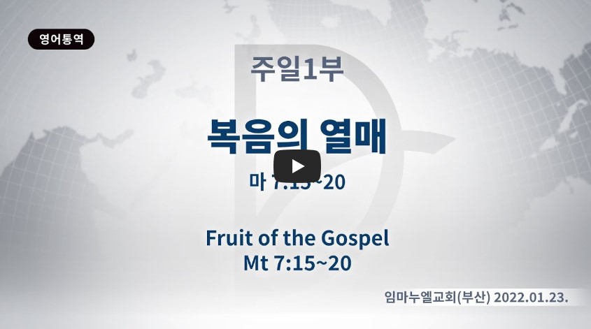 2022년 9월 6일 (화) 분류 주일예배 설교- 주일1부 제목 복음의 열매 성경 마태복음 7:15-30 일시/장소 2022년 1월 23일, 임마누엘교회(부산) 설교 류광수 목사 (녹취정리: 차동호 목사) 출처 (사) 세계