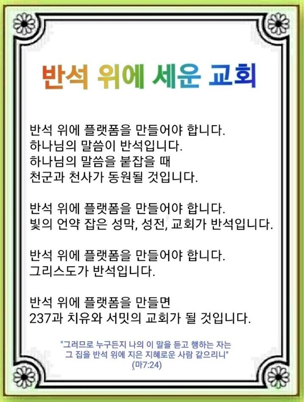 성막의 모든 도구는 그리스도를 나타내며, 그 축복을 누리기 위해 모이는 회막은 예배입니다. 이스라엘은 자기의 장막을, 성막을 향해 만들어 놓고 기도하며 살았습니다. 이것이 우리의 방향과 삶이며, 광야를 정복하는 플랫폼입니다. 하나님은 이방인의 뜰,(237) 기도의 뜰,(치유) 아이들의 뜰을(서밋) 놓친 제1, 2, 3 예루살렘 성전을 무너뜨렸습니다. 우리는 이 세 가지 플랫폼을 회복하면서 3캠프,(기도•미래•달란트) 3체험,(성인식•사명식•파송식) 3시대의(강단•중직자•렘넌트) 플랫폼이 있는 교회를 만들어야겠습니다.