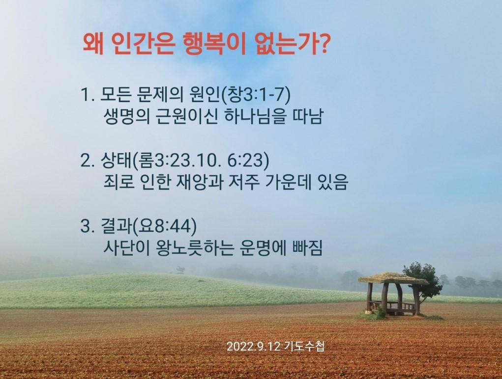 2022년 9월 12일 (월) 분류 2022- 237화요제자훈련(교재01-복음편지01) 제목 복음편지1과: 왜 인간은 행복이 없는가? 성경 로마서 3:23 일시/장소 2022년 1월 25일, 언약교회(온라인) 설교 류광수 목사 (녹