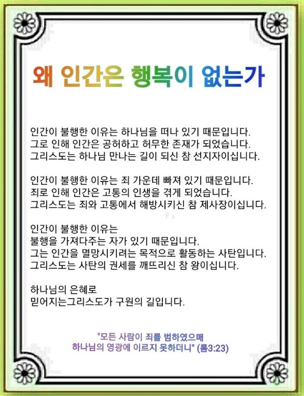 왜 인간은 행복이 없을까요? 하나님을 떠나 사탄에게 걸려 창세기 3장에 소속되어 있기 때문입니다. 그러면 하나님을 만난 사람은 왜 행복이 없을까요? 구원받고도 창세기 3장의 영향을 받기 때문입니다. 이것이 불행의 원인입니다.
