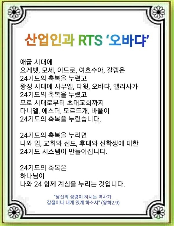 우리가 24기도할 때 나와 업, 교회와 전도, 후대와 신학생에 대한 24기도 시스템이 만들어집니다. 우리의 가장 큰 축복은 하나님이 나와 24 함께 계신다는 것입니다.
