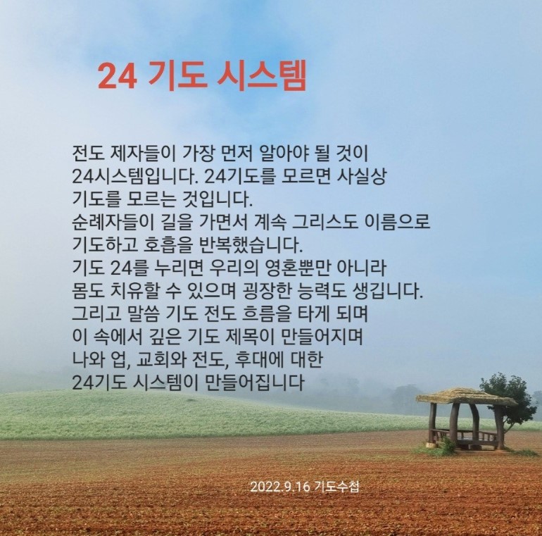 전도 제자들이 가장 먼저 알아야 될 것이 24시스템입니다. 24기도를 모르면 사실상 기도를 모르는 것입니다. 순례자들이 길을 가면서 계속 그리스도 이름으로 기도하고 호흡을 반복했습니다. 이 기도 24를 누리면 우리의 영혼뿐만 아니라 몸도 치유할 수 있으며 굉장한 능력도 생기게 됩니다. 그리고 기도 흐름과 전도 흐름을 타게 됩니다. 이 속에서 깊이 들어가는 기도 제목이 만들어집니다. 오바댜는 선지자 100명을 숨겼는데 이것은 24가 아니면 불가능한 일입니다. 24기도의 축복을 누리면 흐름이 보이는데, 어떤 흐름이 보일까요?