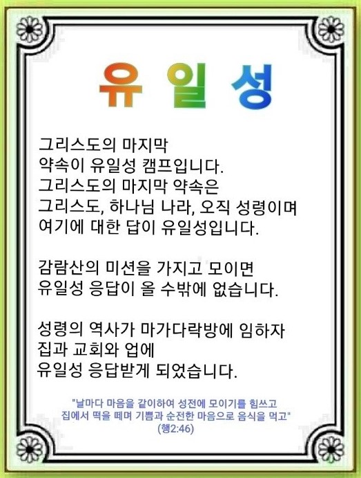 이 약속이 유일성 캠프입니다. 사도행전 1:1은 그리스도에 대한 내용입니다. 이 그리스도께서 직접 하신 말씀이 하나님 나라의 일과(사도행전 1;3) ‘오직 성령’입니다.(사도행전 1:8) 여기에 대한 답이 유일성입니다.