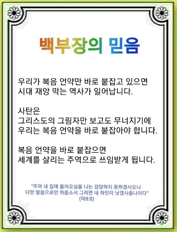 백부장이 병든 하인을 고치기 위해 예수님을 찾아가 “말씀만 하옵소서”라고 말했습니다. 예수님은 백부장의 믿음을 보시고 감동하셔서 “이스라엘에서 이만한 믿음을 본 적이 없다”라고 하셨습니다. 백부장은 말씀이 무엇인지, 예수 그리스도가 누구신지, 구원받은 내가 누구인지 안 것입니다. 우리가 정확한 하나님 말씀을 붙잡는 시간에 천사가 임하며,(시편 103:20) 하나님의 뜻을 말씀 속에서 붙잡을 때는 군대가 동원됩니다.(시편 103:21) 기도하고 예배하는 시간에 말씀을 붙잡을 때는 주의 천군•천사가 동원됩니다.(시편 103:22) 이 말씀이 성취된 현장에 백부장이 있었습니다.