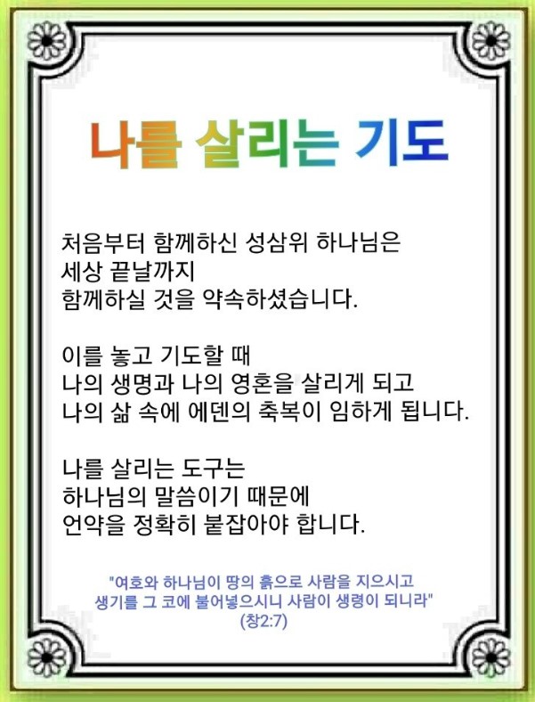 나의 생명을 살려내고,(창세기 1:27) 나의 영혼을 살려내고,(창세기 2:7) 나의 삶 속에 에덴의 축복이 임하게 하는 것입니다.(창세기 2:17-18) 이것을 기도 속에서 살려내고,(요한복음 20:22) 언약 가지고 사명 속에서 받아들이는 것입니다.(사도행전 1:3, 8, 14)