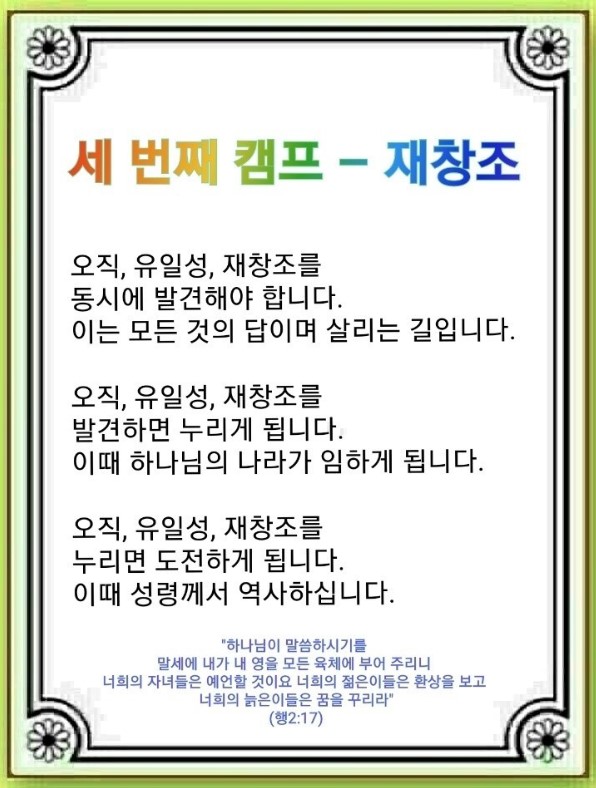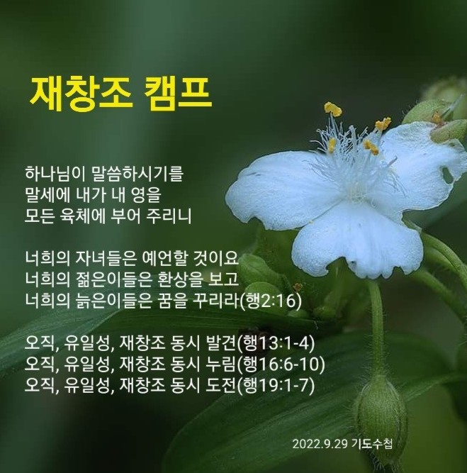2022년 9월 29일 (목) 분류 흩어진 제자들(2022-제123RUTC응답24)-05 제목 세 번째 캠프- 재창조 성경 사도행전 2:17-18 일시/장소 2021년 2월 5일, 마산 주사랑교회 설교 류광수 목사 (녹취정리: 차동호 목