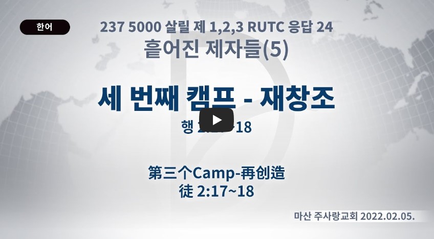 2022년 9월 29일 (목) 분류 흩어진 제자들(2022-제123RUTC응답24)-05 제목 세 번째 캠프- 재창조 성경 사도행전 2:17-18 일시/장소 2021년 2월 5일, 마산 주사랑교회 설교 류광수 목사 (녹취정리: 차동호 목