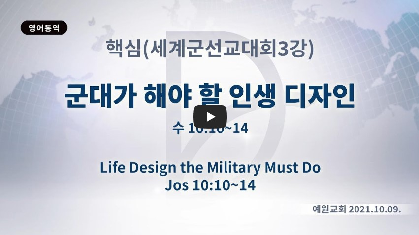 2022년 10월 6일(목) 분류 핵심훈련- 2021 세계군선교대회 제목 제1,2,3 RUTC응답의 현장(38)-(세계군선교대회 3강) 군대가 해야 할 인생 디자인 성경 여호수아 10:10-14 일시/장소 2021년 10월 9일, 예원교