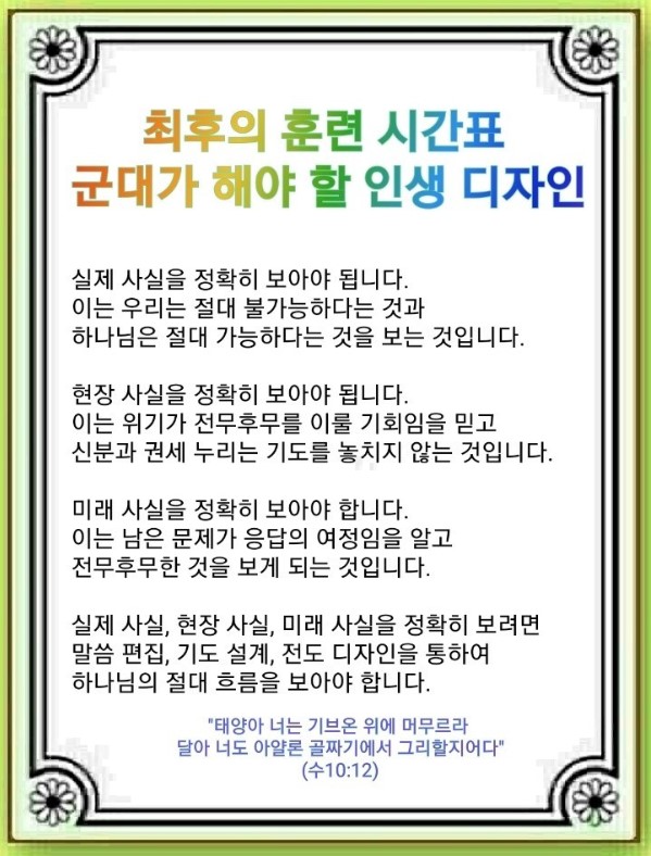 최후의 훈련 시간표 - 군대가 해야 할 인생 디자인(여호수아 10:1-14)