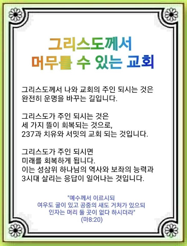 헤롯 성전에는 이방인의 뜰, 기도의 뜰, 아이들의 뜰이 없었습니다. 이 세 가지 뜰을 회복하는 주인이 그리스도입니다. 이런 교회가 필요합니다. 세 가지 뜰을 회복하는 교회의 언약을 붙잡을 때 절대 여정이 회복됩니다. 이때부터 237나라를 살릴 플랫폼과 빛을 비추는 파수망, 237나라와 소통될 수 있는 영적 안테나가 만들어집니다.