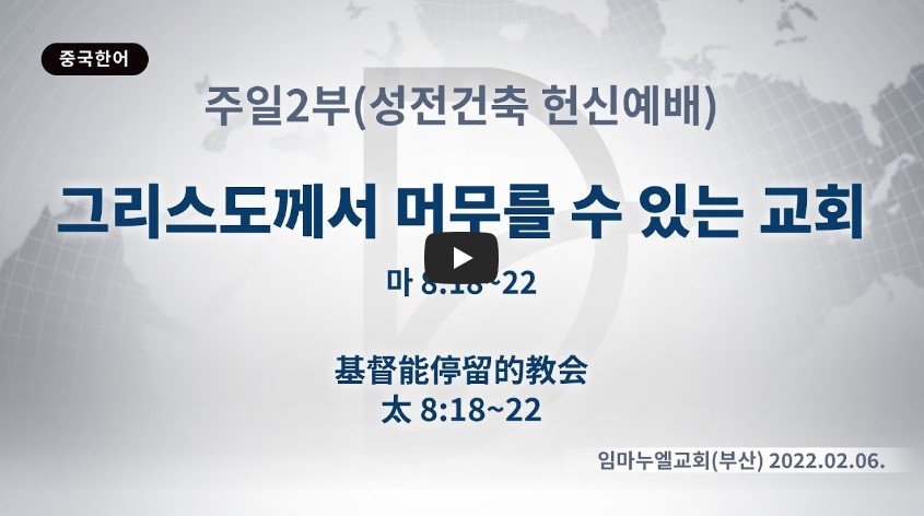 2022년 10월 8일(토) 분류 주일예배 설교- 주일2부 제목 (성전건축헌신) 그리스도께서 머무를 수 있는 교회 성경 마태복음 8:18-22 일시/장소 2022년 2월 6일, 임마누엘교회(부산) 설교 류광수 목사 (녹