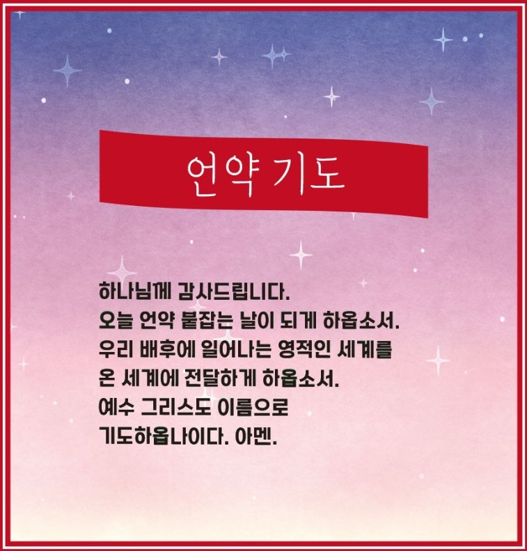 [언약 기도] 하나님께 감사드립니다. 오늘 언약 붙잡는 날이 되게 하옵소서. 우리 배후에 일어나는 영적인 세계를 온 세계에 전달하게 하옵소서. 예수 그리스도 이름으로 기도하옵나이다. 아멘.